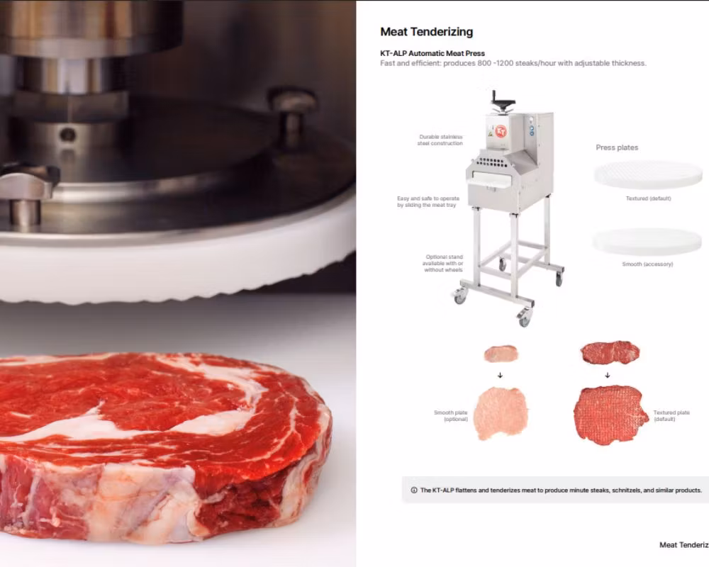 KT-ALP är en professionell köttpress som under mer än 30 års produktutveckling har finslipats till ett pålitligt original. Maskinen plattar ut och mörar kött- och fågelprodukter utan viktminskning, vilket ger en jämn tjocklek och konsistens som behåller sin saftighet vid tillagning.
