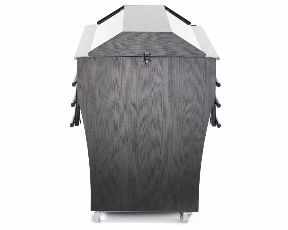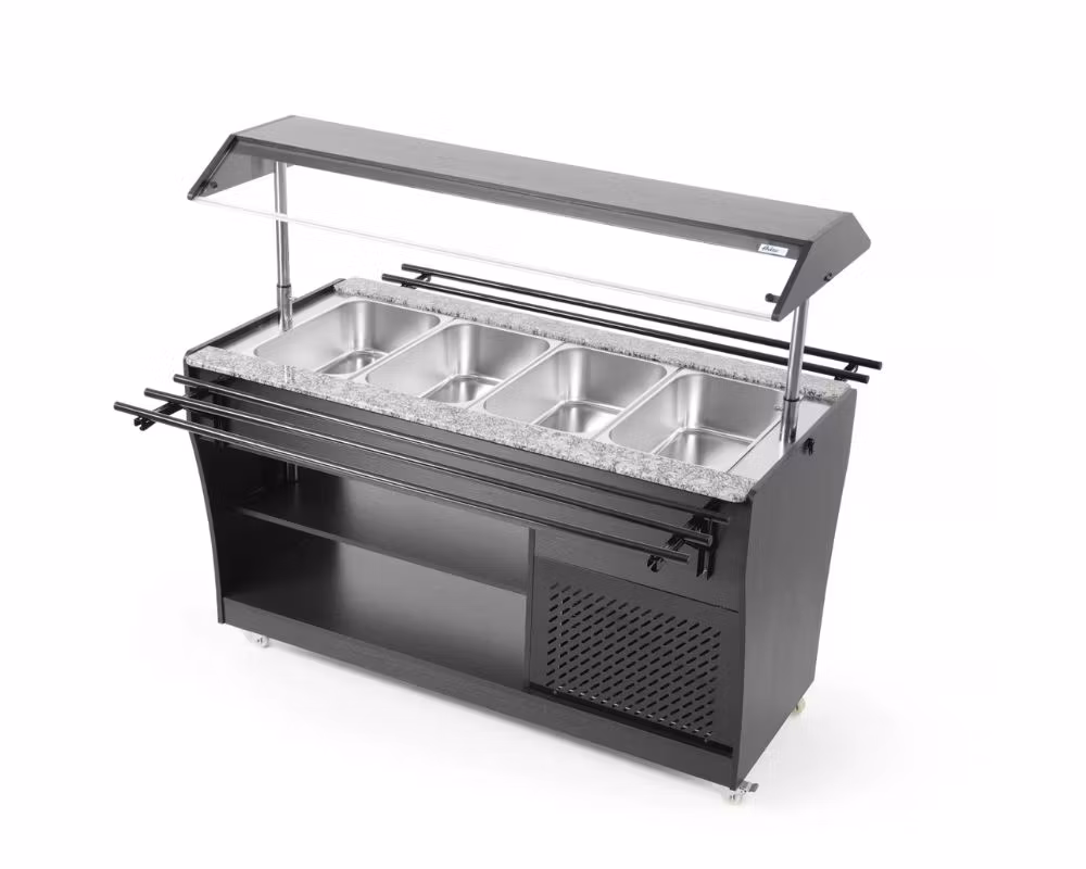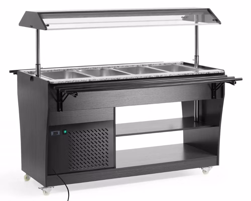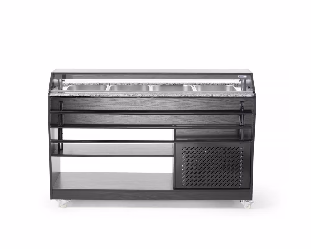 Det robusta höljet i rostfritt stål och svart plywood, tillsammans med en modern överbyggnad i härdat glas, ger en stilren presentation. Den inbyggda belysningen lyfter fram råvarorna, och den sänkbara baldakinen fungerar även som skydd när buffén inte används. Extra förvaring finns lättillgänglig via den generösa underskivan.
