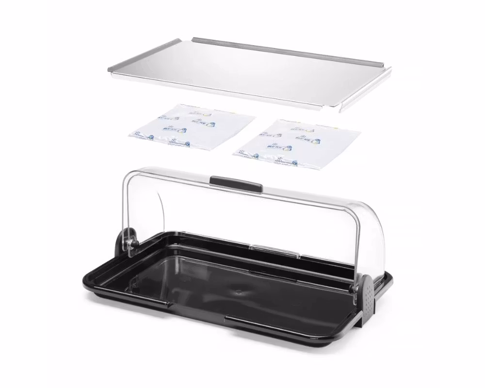 Displayen är tillverkad i polypropen med bricka i rostfritt stål, vilket ger både hållbarhet och enkel rengöring. Kyl-/värmeelementet placeras under den rostfria brickan och hjälper till att bibehålla temperaturen längre, så att maten håller sig fräsch och aptitlig. Setet levereras med 2 gelinsatser för kylning eller uppvärmning och är dessutom diskmaskinssäker.