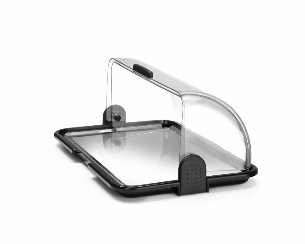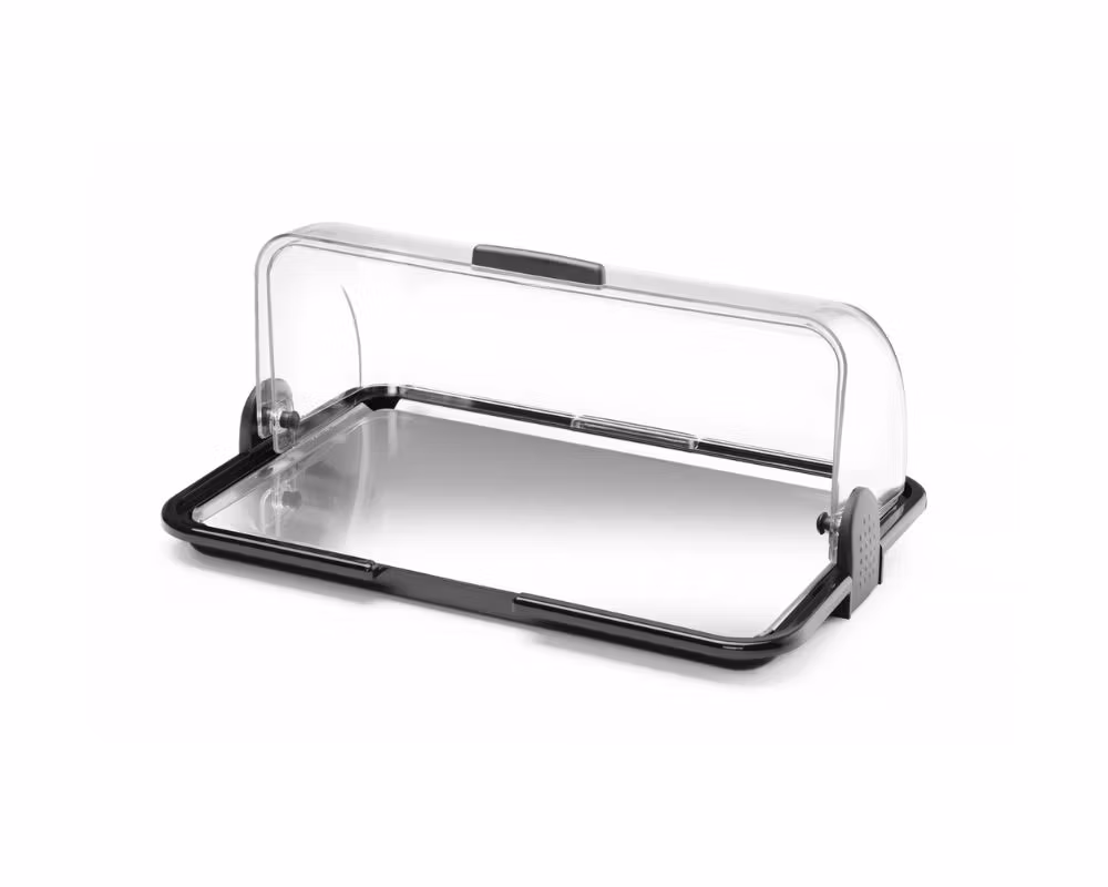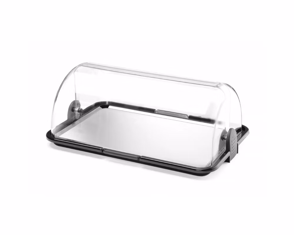 Den transparenta roll-top-kåpan ger tydlig exponering av innehållet samtidigt som maten skyddas. Tack vare konstruktionen får gäster och personal enkel åtkomst från båda sidor, vilket gör den idealisk för buffé, frukostservering och självservering.