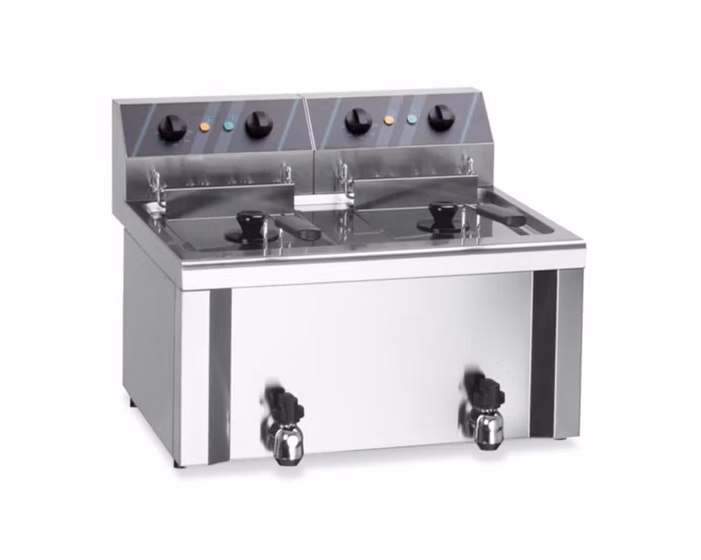 En kompakt och effektiv elektrisk bordsfritös med dubbla bassänger, perfekt för mindre restauranger, caféer och verksamheter som behöver flexibilitet i ett smidigt format. Med två separata bassänger på 5/6 liter vardera kan du fritera olika produkter samtidigt.