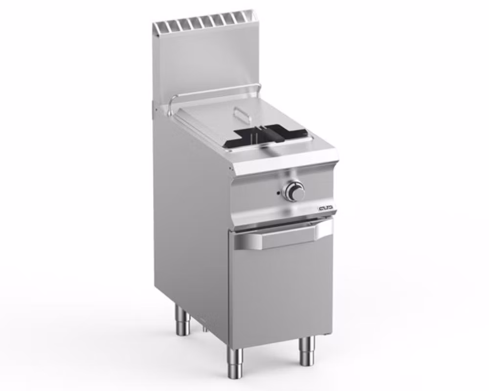 Professionell gasdriven fritös med V-formad tank, utvecklad för restaurang, café och storkök där hög prestanda och effektiv oljeanvändning är viktigt. Den innovativa V-formade konstruktionen gör att oljan värms upp snabbare och ger jämn och effektiv fritering även vid hög belastning.