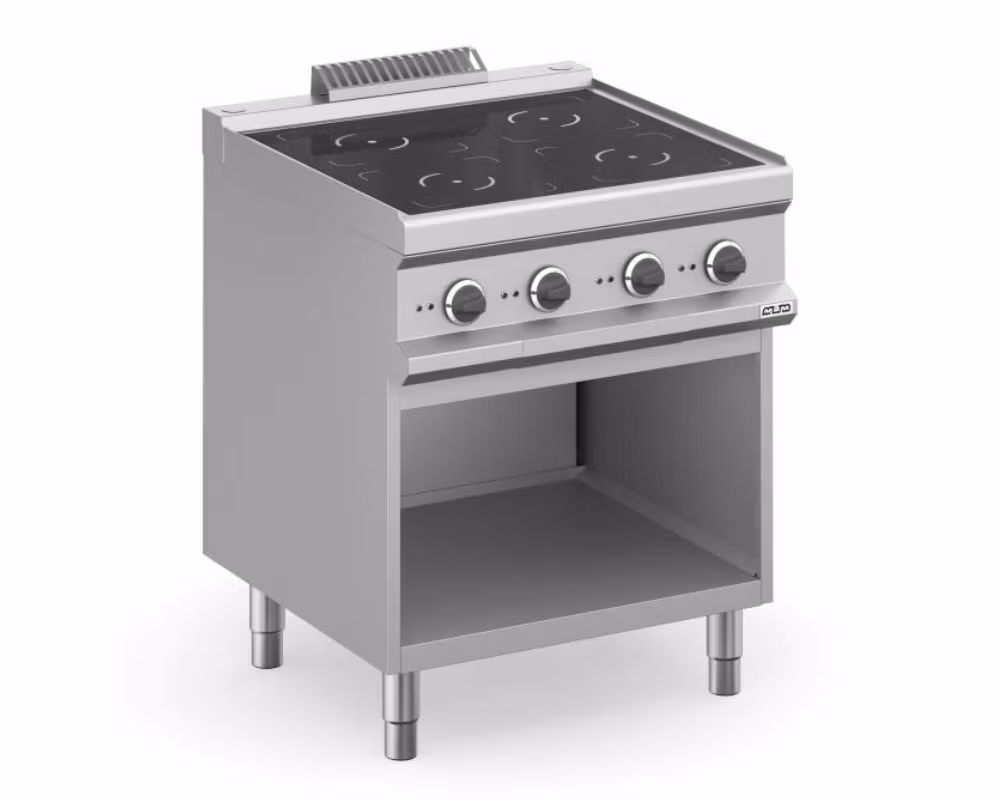 En kraftfull och energieffektiv induktionsspis med fyra kokzoner och öppet underskåp, utvecklad för professionella kök där hög kapacitet, snabb uppvärmning och effektiv arbetsyta är avgörande. Den integrerade öppna underdelen ger praktisk förvaring av kastruller, pannor eller köksutrustning direkt under spisen.