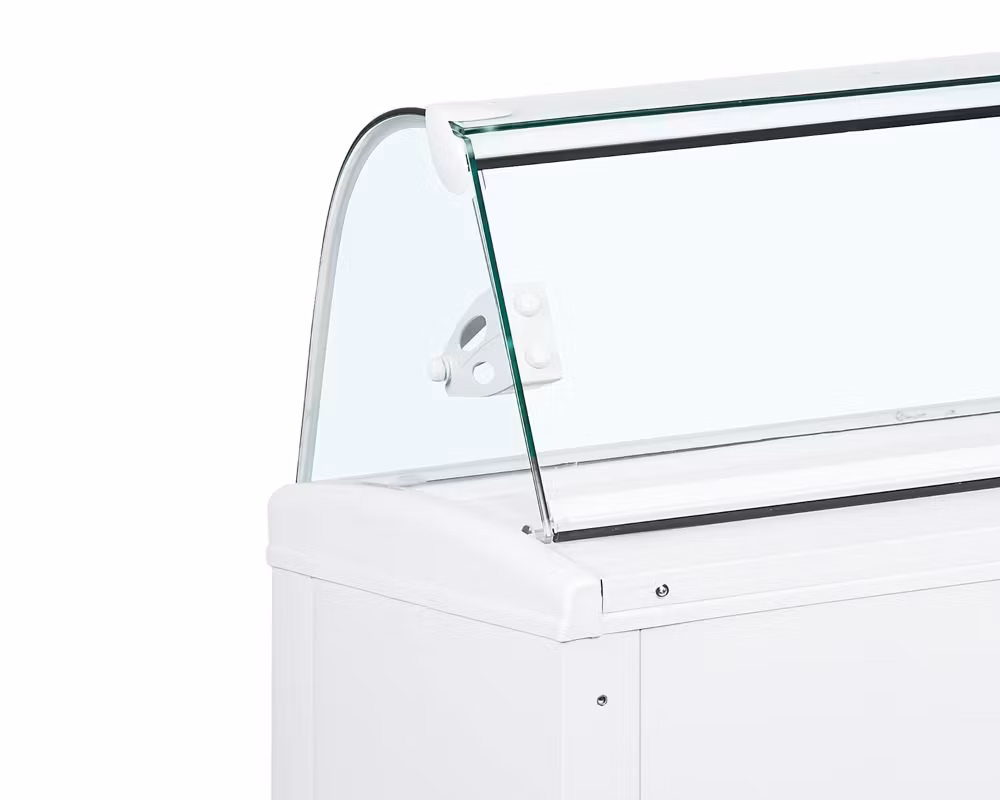 Den ventilerade kylningen säkerställer en jämn temperatur i hela montern och ger snabb återkylning vid frekventa öppningar. Det böjda glaset ovan och i front ger utmärkt produktsynlighet, medan det upplyftbara bakre locket gör det möjligt för två personer att servera samtidigt – perfekt under rusningstid.