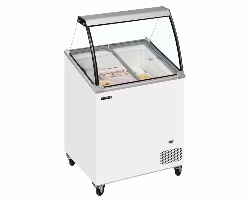 IC201SCE+SO är en smidig och driftsäker skopglassfrys från TEFCOLD, framtagen för caféer, glassbarer och serveringsmiljöer som behöver tydlig presentation, hygienisk hantering och stabil frysprestanda i ett kompakt format. Det välvda nysskyddet i glas tillsammans med vinklade skjutlock med lås ger god insyn och trygg användning i publika miljöer.