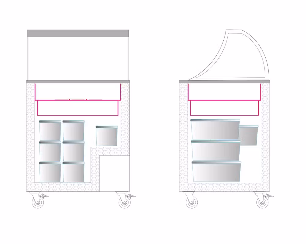 Modellen är förberedd för skopkorgar som tillval. Den rekommenderade lösningen är korgar med plats för 4 st 5-liters plastbägare, vilket ger en effektiv och överskådlig servering. Förvaring under korgarna ger extra flexibilitet under service, och den invändiga LED-belysningen förbättrar överblicken.