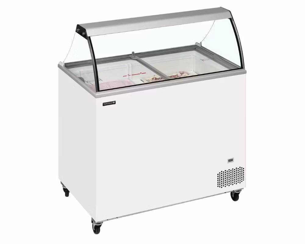 IC302SC-SO är en rymlig och driftsäker skopglassfrys från TEFCOLD, framtagen för caféer, glassbarer och serveringsmiljöer som kräver säljande presentation, hygienisk hantering och stabil frysprestanda. Det välvda nysskyddet i glas skyddar glassen och ger samtidigt god insyn, medan plana skjutbara glaslock med lås säkerställer trygg användning i publika miljöer.