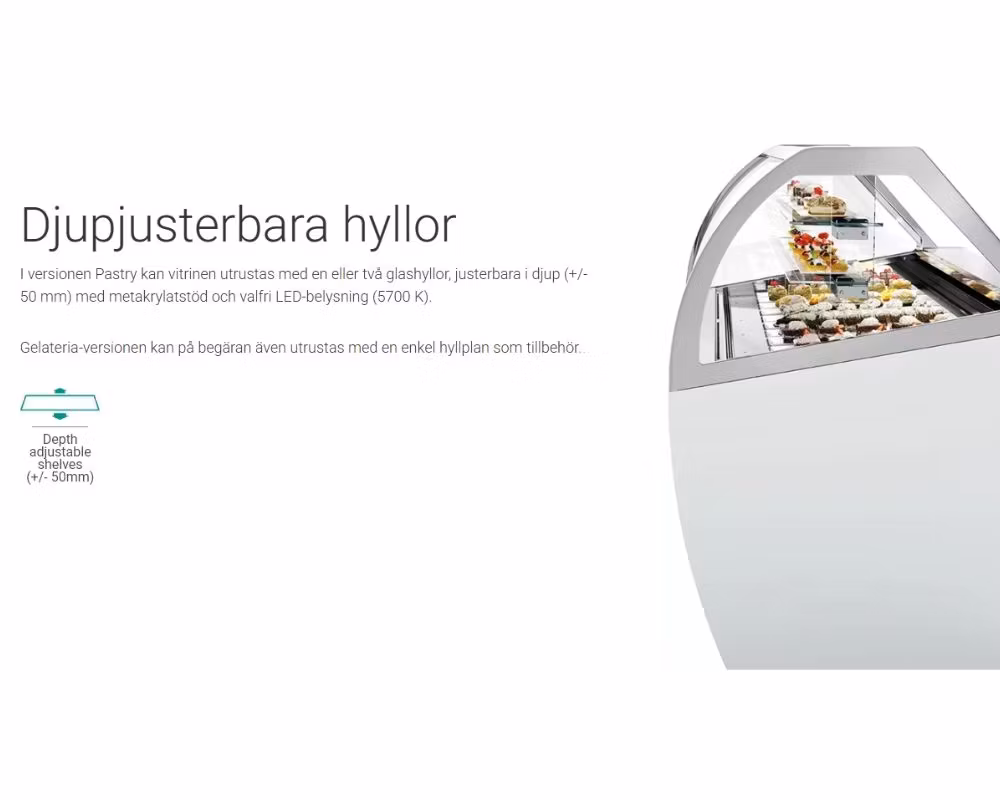 I Pastry-versionen kan vitrinen utrustas med en eller två glashyllor, justerbara i djup (+/− 50 mm), med metakrylatstöd och valfri LED-belysning (5700 K).