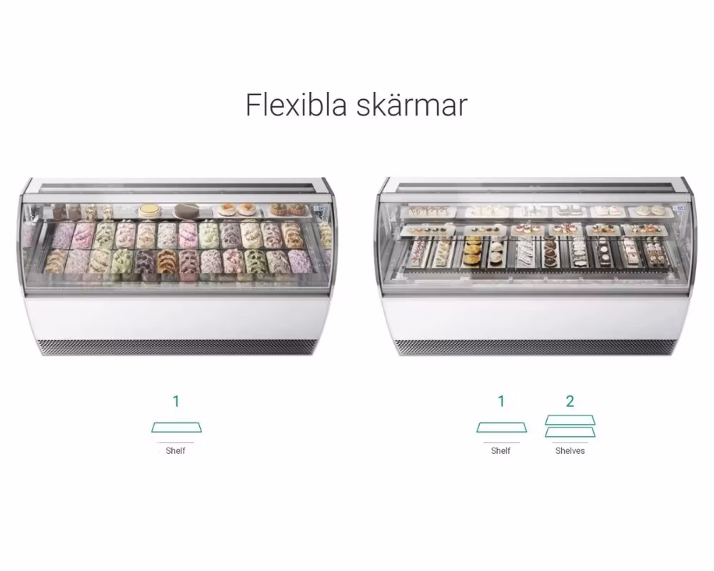 Med funktionen Dual Temperature kan montern enkelt växla mellan negativ och positiv temperatur. Det gör att den kan användas både som gelato-monter och bakverksmonter, genom att montera lutade rostfria brickor (7°).