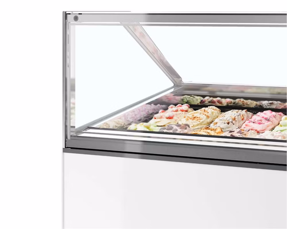 Frontglaset kan öppnas framåt vid behov, vilket underlättar rengöring och service. Den invändiga finishen i rostfritt stål ger hög hygien och lång livslängd, medan LED-belysningen lyfter presentationen av glassen.