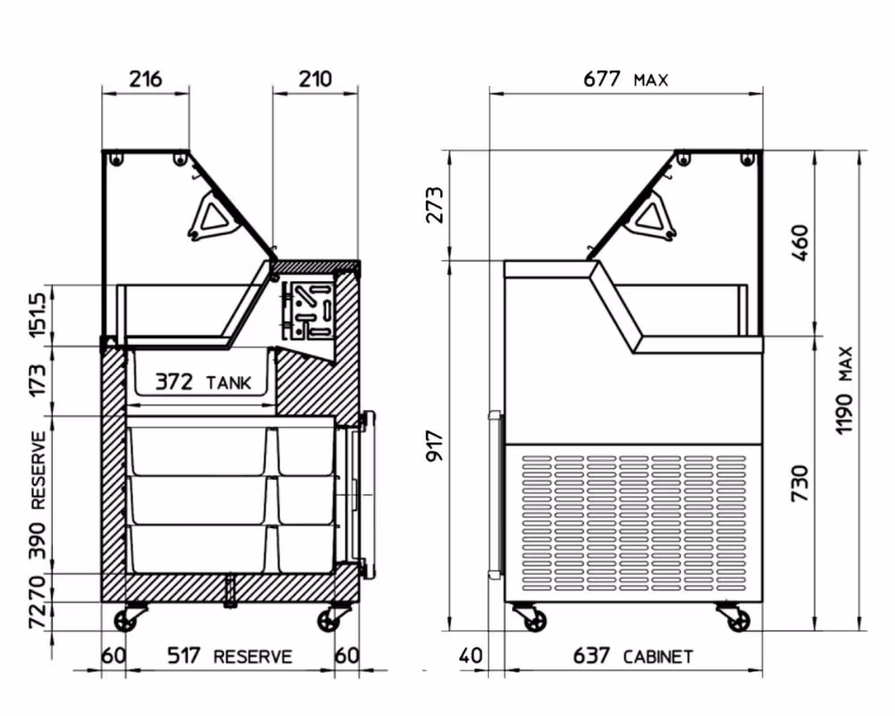 Displayen är anpassad för Napoli-plåtar (medföljer ej) och har ett upplyftbart bakre lock, vilket gör att två personer kan servera samtidigt – perfekt under hög belastning. Invändig LED-belysning med knapp lyfter fram glassen, medan det integrerade förvaringsutrymmet ger snabb och enkel åtkomst under service.