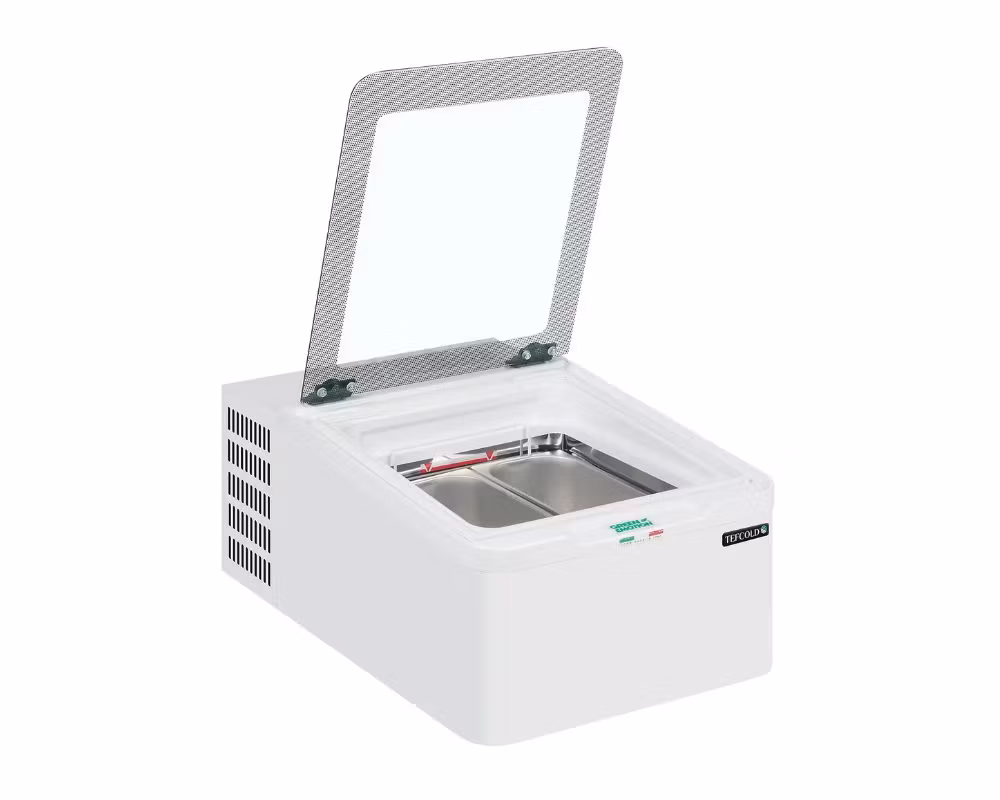 Modellen rymmer 2 Napoli-plåtar (à 5 liter, medföljer ej) och är utrustad med statisk kylning, ställbara fötter och en invändig behållare av rostfritt stål — perfekt för hygienisk och hållbar daglig användning. Ett tillvalsbart pinnglasstråg finns för verksamheter som vill bredda sitt utbud.