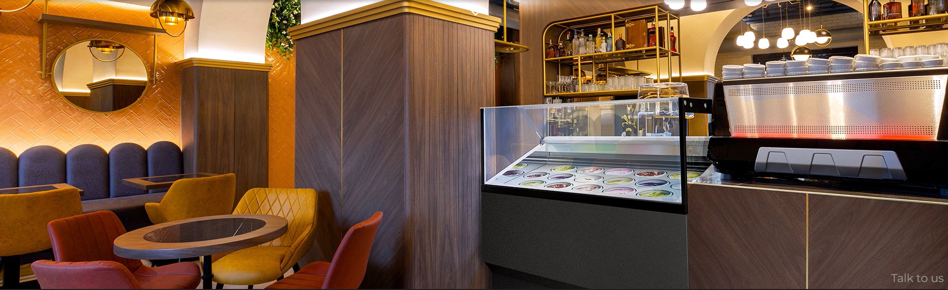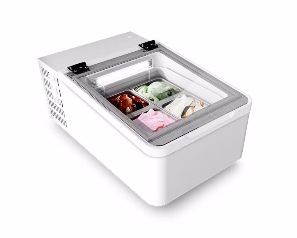 Skopglassfrys ICE2 är en effektiv och platsbesparande lösning för servering av skopglass i exempelvis caféer, bufféer och mindre restauranger. Den vinklade displayen ger optimal presentation av dina glassorter, samtidigt som det plant gångjärnsförsett glaslocket gör det enkelt för personal att nå innehållet.