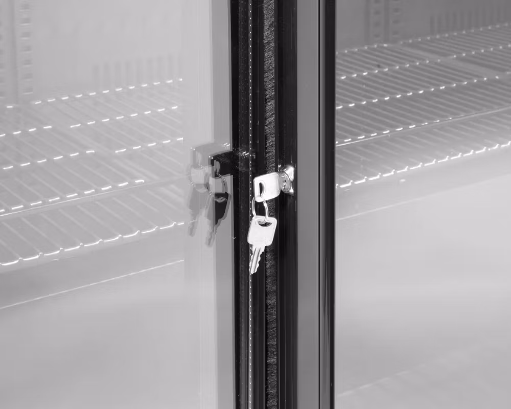 Konstruktionen i pulverlackerat stål och härdat glas ger hög hållbarhet och lång livslängd, samtidigt som de låsbara dörrarna skyddar innehållet.