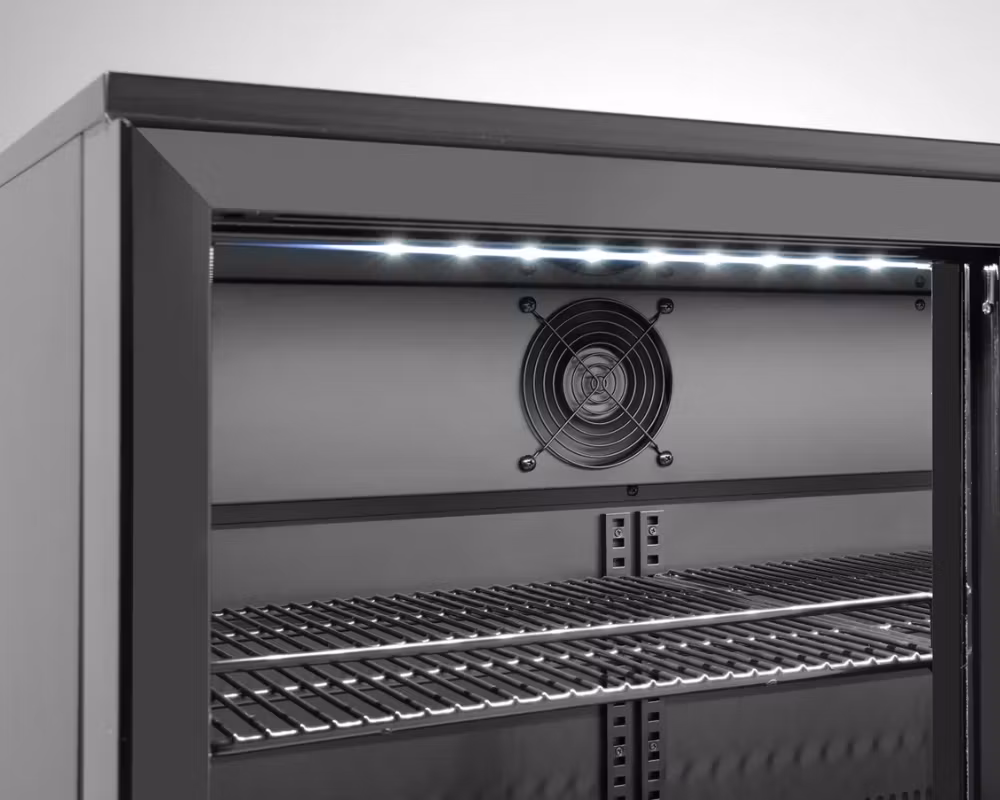 Den ventilerade kylningen säkerställer en jämn temperaturfördelning, medan den automatiska avfrostningen minimerar underhåll och driftstopp. Perfekt för förvaring av läsk, öl, vin och andra drycker i bar, restaurang och café.