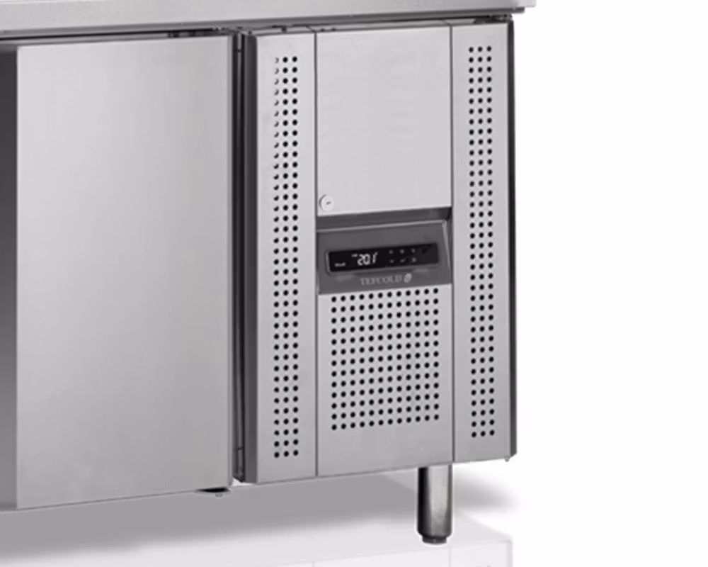 Kylbänken levereras med 2 självstängande dörrar och GN1/1-näthyllor som standard, och kan utrustas med lådor som tillval. En ventilationsbox är placerad på höger sida, utan att kräva extra installationsutrymme för korrekt luftflöde. Ställbara ben säkerställer stabil placering i professionella köksmiljöer.