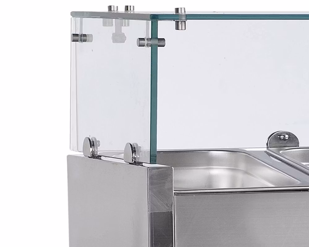 Enheten är tillverkad helt i rostfritt stål (SS201) och utrustad med glaskonstruktion som skyddar livsmedel, vilket säkerställer både hygien och god överblick över ingredienserna.