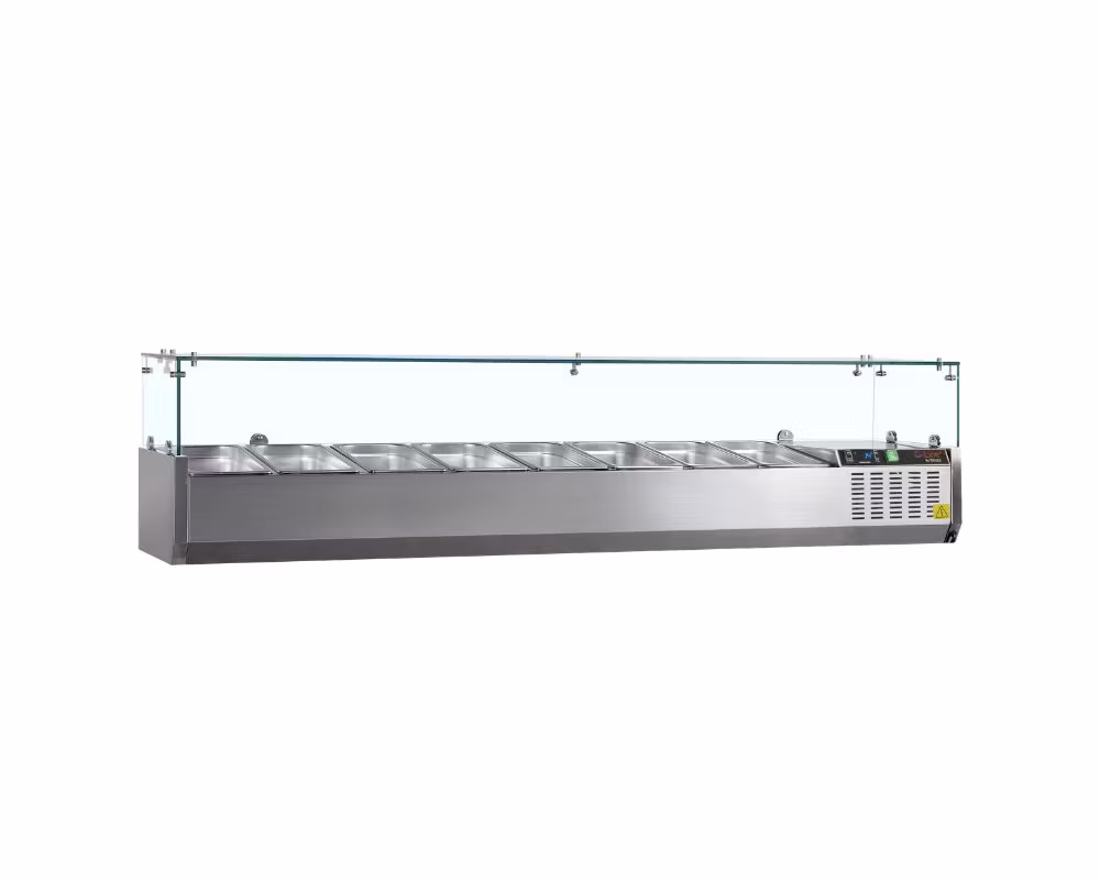 GVC33-180 är en extra rymlig vitrinkylenhet för professionella kök där maximal kapacitet och effektiv arbetsorganisation är avgörande. Med plats för 8 x GN1/4-kantiner (medföljer ej) och en bredd på 1800 mm är modellen idealisk för pizzerior, salladsbarer och snabbmatsrestauranger med högt tempo.