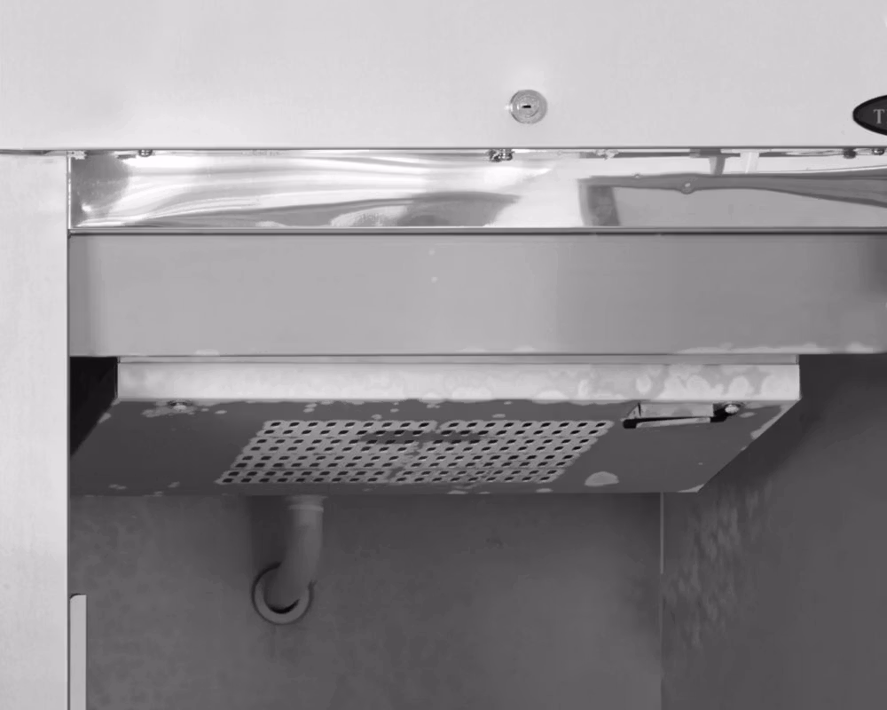 De 2 självstängande massiva dörrarna bidrar till energieffektiv drift och är utrustade med lås för säker förvaring. Kylen levereras med 6 förkromade näthyllor, anpassade för GN-format, med en maxbelastning på 110 kg/m² per hylla. De kraftiga hjulen (2 med broms) gör enheten enkel att flytta vid rengöring och service.