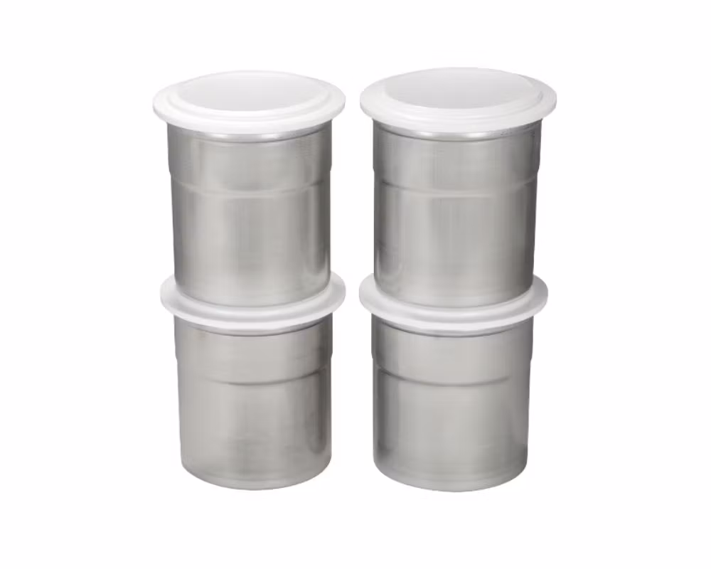 Originalbägare i rostfritt kromstål, 4-pack med lock och utvecklade för intensiv daglig användning. Dessa Pacosserings®-bägare är standard i alla Pacojet-recept och säkerställer korrekt fyllnadsgrad, optimal infrysning och konsekvent hög kvalitet vid varje användning.