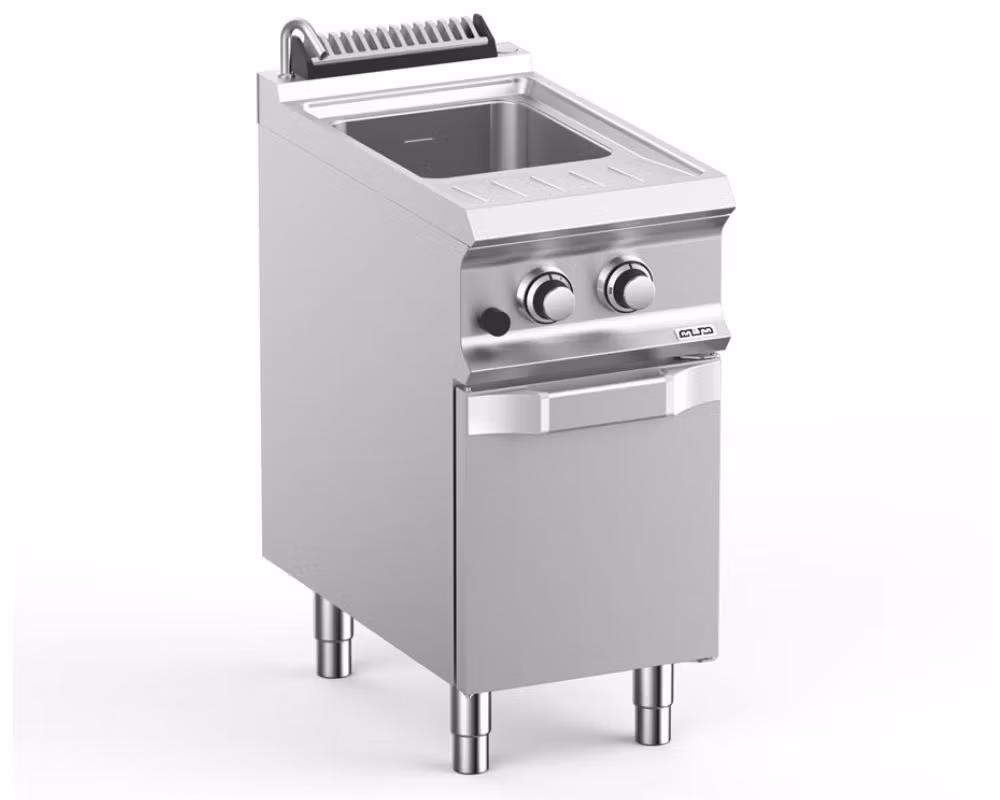 Professionell gaspastakokare med 26 liters kapacitet, utvecklad för restaurang, storkök och professionella kök där pasta behöver tillagas snabbt och effektivt under service. Modellen är en del av Domina Pro 700-serien och levereras med underskåp, vilket gör den enkel att integrera i modulära kökslinjer.