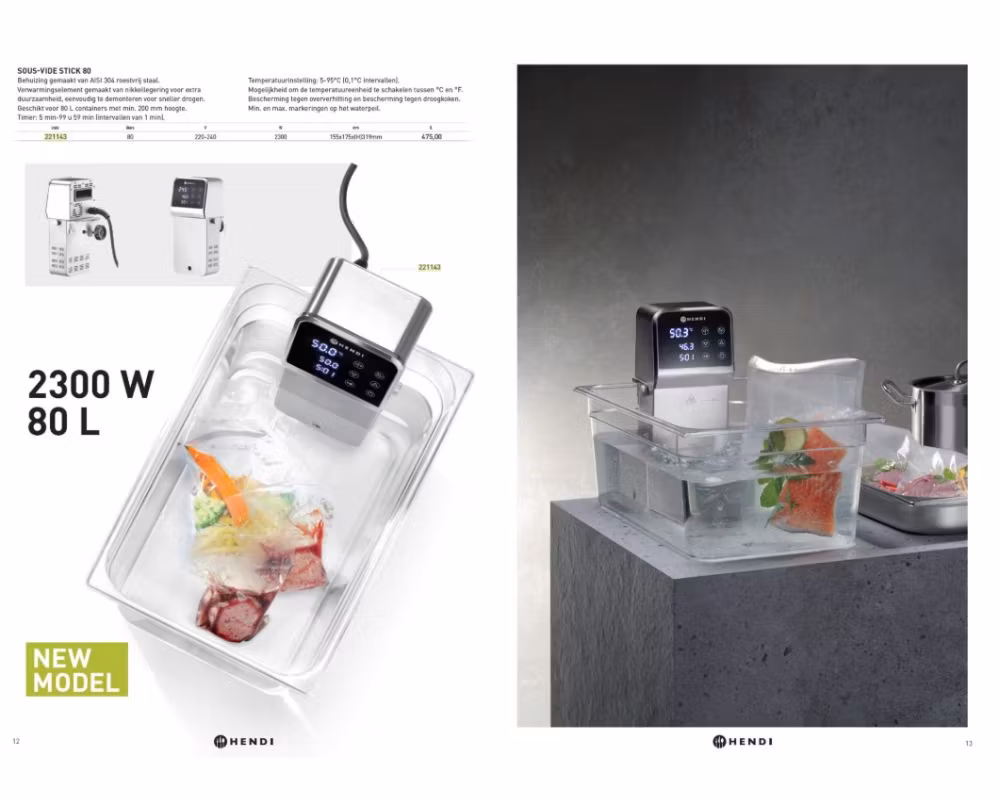 Denna professionella sous-vide-pinne är utvecklad för restaurang, storkök och avancerad matproduktion där hög kapacitet och exakt temperaturkontroll är avgörande. Med möjlighet att arbeta i behållare upp till 80 liter säkerställer den jämna och reproducerbara resultat vid större volymer.