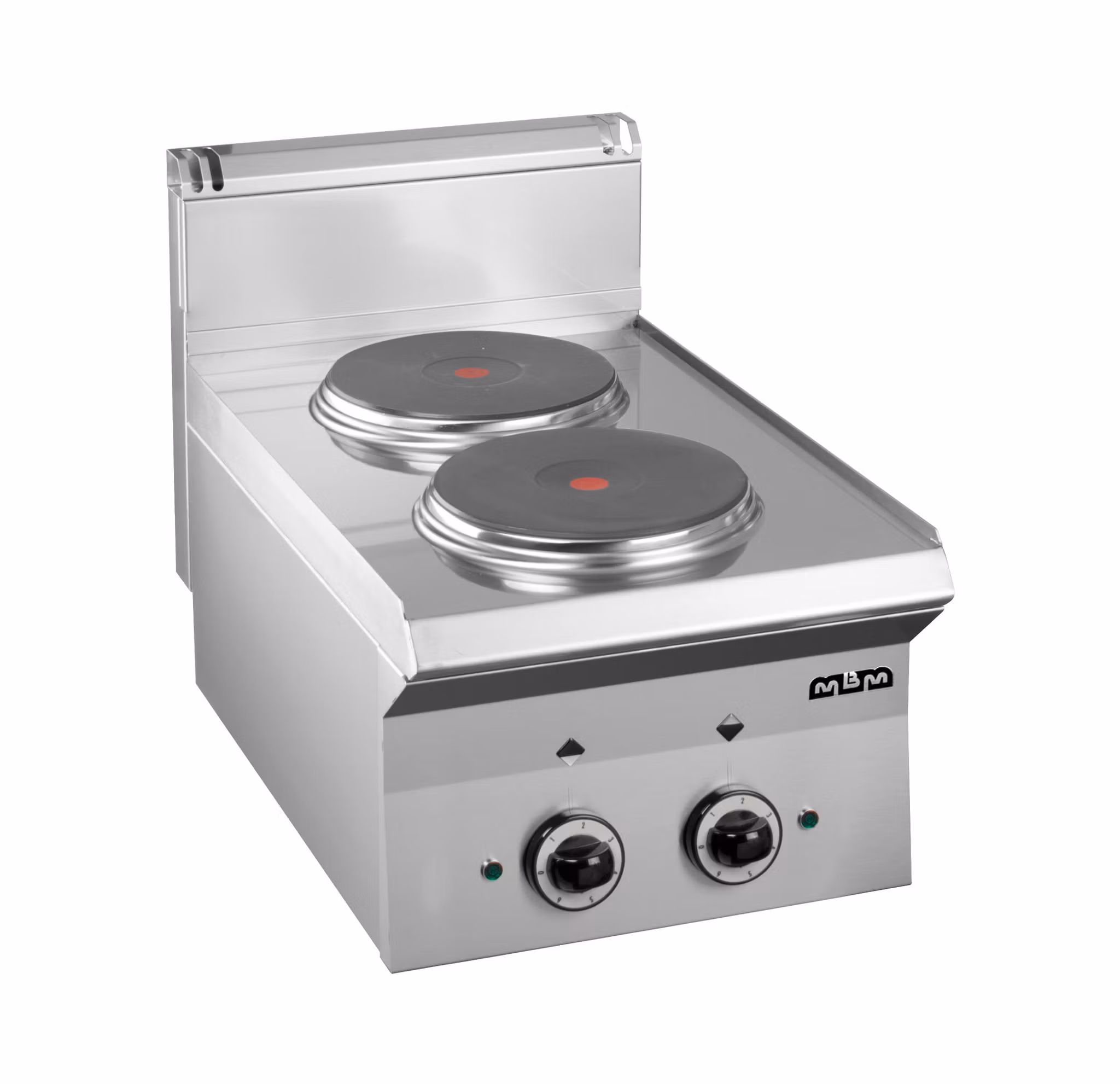 Kompakt och professionell elspis med två kraftfulla kokplattor, utvecklad för restaurang, storkök, café och mindre köksmiljöer där effektiv matlagning och platsbesparing är viktigt. Den praktiska bänkmodellen gör spisen idealisk för arbetsbänkar, mindre kök eller som ett komplement i större kökslinjer.