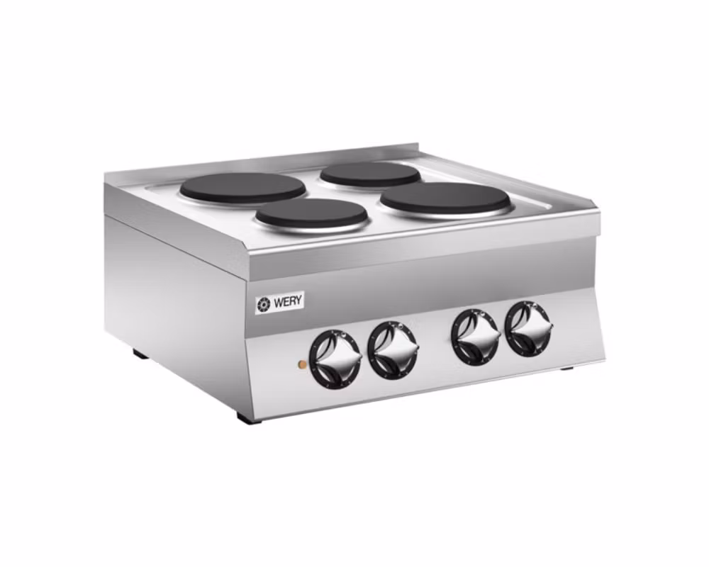 Den elektriska spisen Wery PCE 67P är en kraftfull och flexibel modell för restauranger, caféer och storkök som behöver hög kapacitet på begränsad yta. Spisen är utrustad med fyra kokplattor i gjutjärn på Ø22 cm, vardera med en effekt på 2,6 kW. Effekten för varje kokplatta regleras individuellt i sex steg, vilket ger full kontroll och möjlighet att anpassa värmen efter olika råvaror och tillagningsbehov.