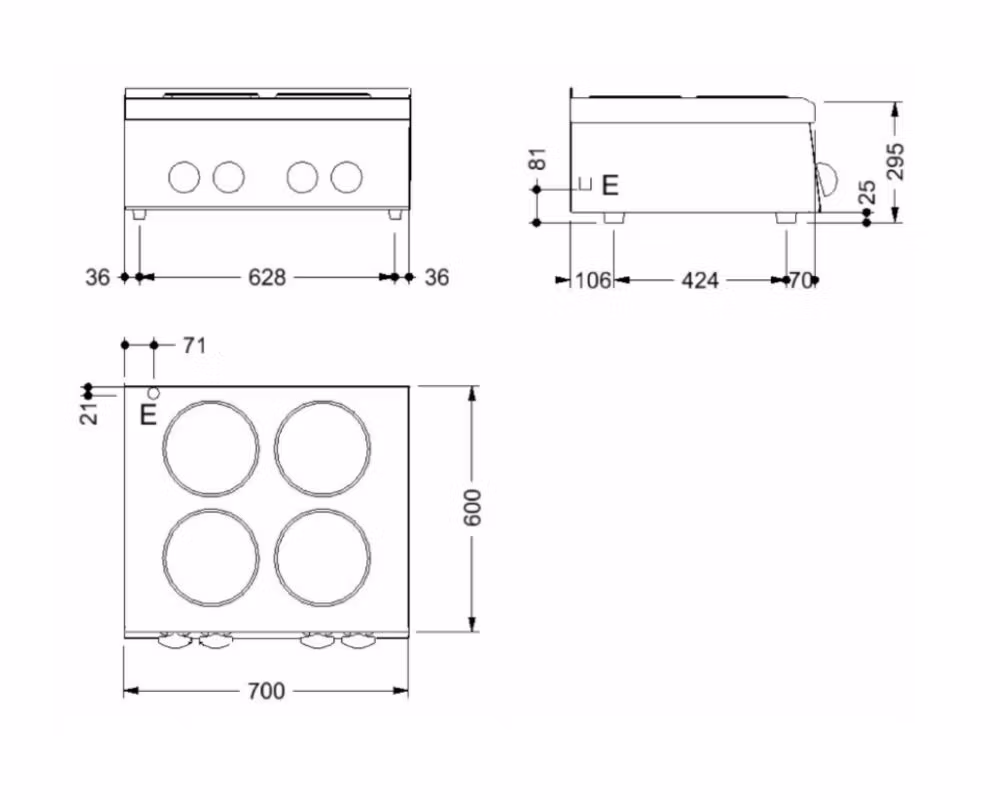 Med en total effekt på 10,4 kW kan spisen hantera flera kastruller och kokkärl samtidigt, vilket gör den idealisk för intensiv drift. Konstruktionen i rostfritt stål med topp, front och sidor är både slitstark och lätt att rengöra. Reglagen är frontplacerade och utformade för att skyddas mot vatten och spill.