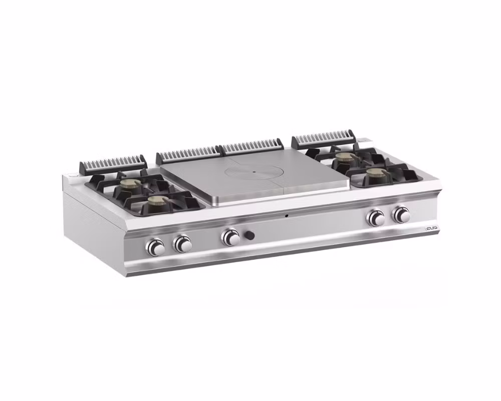 Professionell gasspis med solid gjutjärnshäll och 4 kraftfulla brännare, utvecklad för restaurang, storkök och professionella köksmiljöer där hög kapacitet och jämn värmefördelning är avgörande. Den stora kokytan gör spisen idealisk för kastruller, stekpannor och större kokkärl i restauranger och hotellkök.
