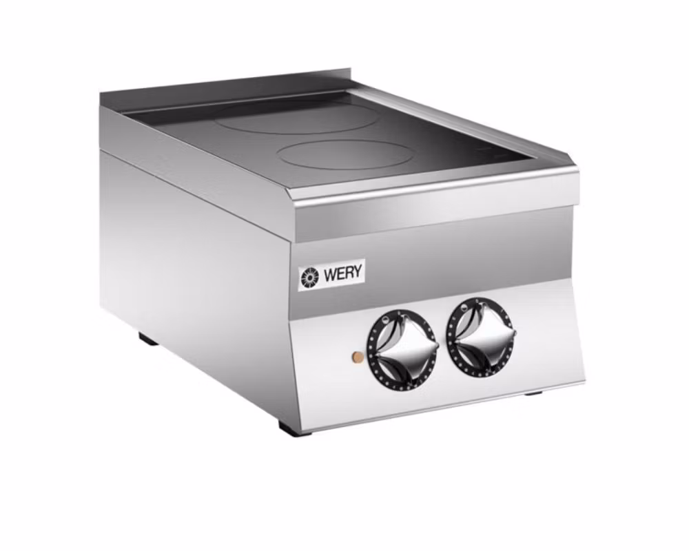 Den elektriska glaskeramikspisen Wery PCVE 64P är en kompakt och modern spislösning för professionella kök. Den är utrustad med två kokzoner på Ø22 cm, vardera med en effekt på 2,5 kW. Effekten för varje kokzon regleras individuellt i sex steg, vilket ger full flexibilitet i matlagningen.