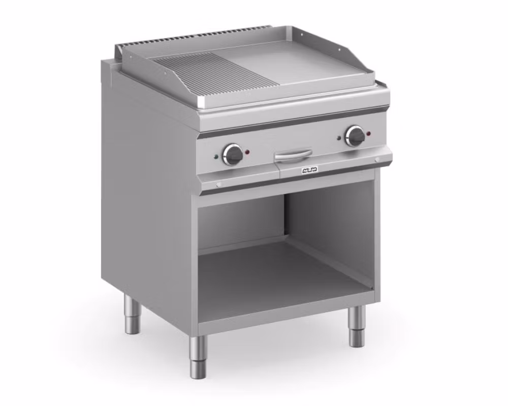 En professionell elektrisk stekhäll med kombinerad stekyta, där hälften är slät och hälften räfflad, monterad på öppet underskåp som ger stabilitet och praktiskt arbetsutrymme i köket. Den kombinerade stekytan gör det möjligt att tillaga flera olika typer av rätter samtidigt.
