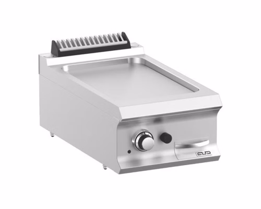 Stekplattan är tillverkad i 15 mm tjockt specialstål med kromad yta, vilket säkerställer stabil temperatur över hela stekytan och lång livslängd även vid intensiv användning i restauranger och storkök.