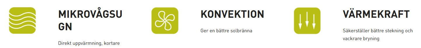 • Tre värmeteknologier i ett: mikrovågor (0–100 %), konvektion (20–100 %) och termisk impingement.