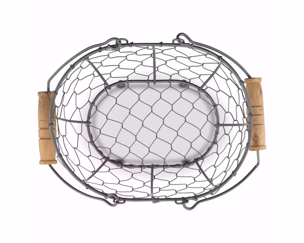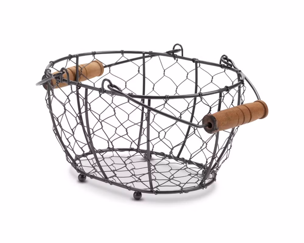 En vacker och funktionell serveringskorg med målad järntråd och ett robust trähandtag. Korgen står stabilt på fyra rundade fötter, vilket ger en elegant och praktisk lösning för servering.