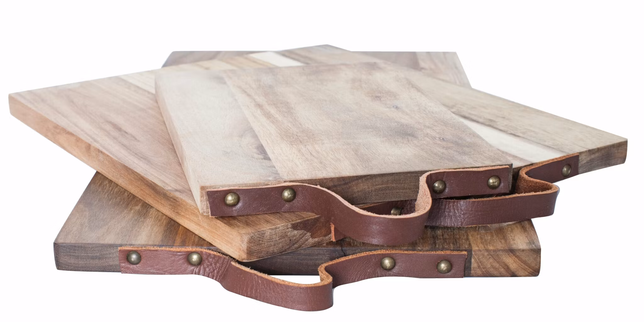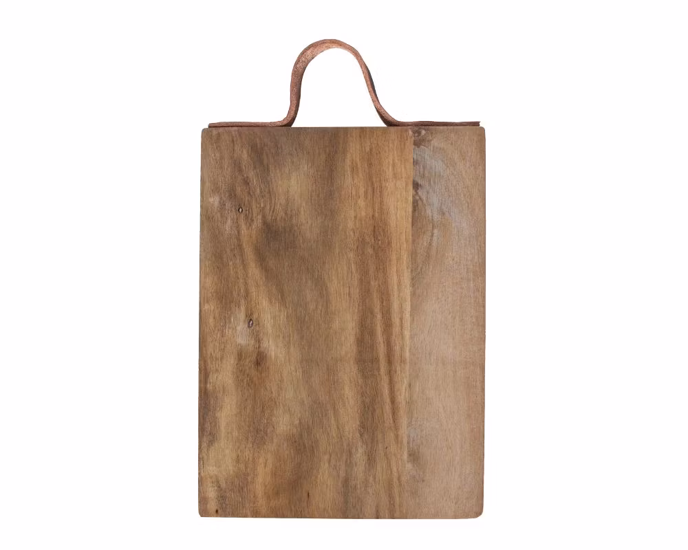 En dekorativ och rustik serveringsbricka tillverkad i FSC-märkt akaciaträ, vilket ger en naturlig och hållbar kvalitet. Brickan är utrustad med ett vackert och slitstarkt läderhandtag, som ger ett mjukt och bekvämt grepp vid servering.