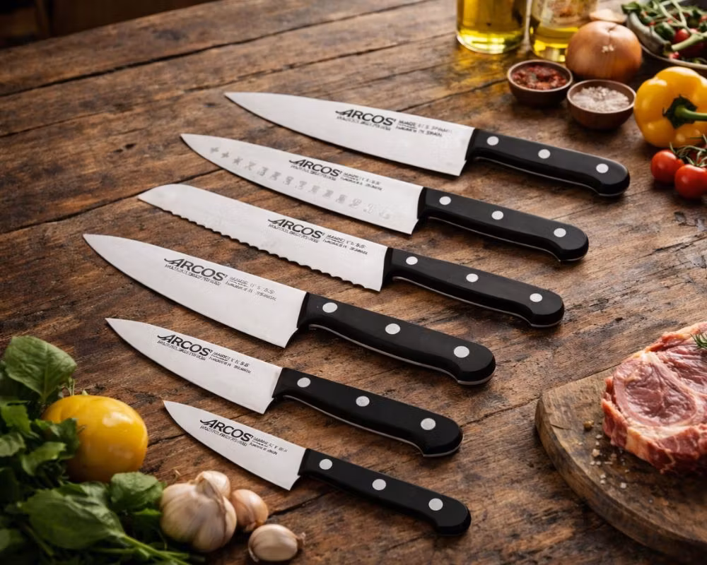 Set med 6 st kvalitetsknivar från spanska tillverkaren Arcos. Knivarna har tåliga plasthandtag av polyoximetylen (POM) som ger ett behagligt grepp. Förvaringsväska ingår för smidig förvaring och transport.