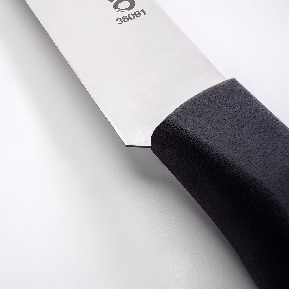 Det ergonomiska plasthandtaget ger ett stabilt grepp även vid fuktiga arbetsförhållanden, vilket gör kniven både bekväm och säker att använda i det professionella köket.