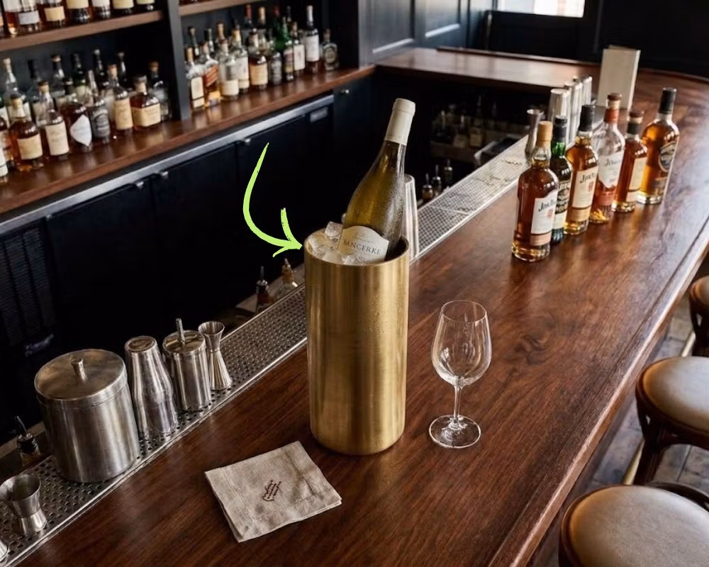 Den dubbelväggade designen isolerar effektivt och håller flaskan kyld längre utan behov av is, vilket gör den perfekt för servering av vin, champagne och mousserande drycker. Den kompakta storleken gör den smidig att placera direkt på bordet eller i baren.