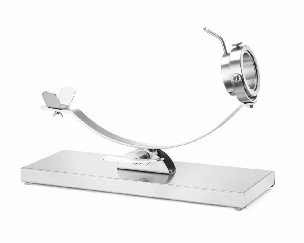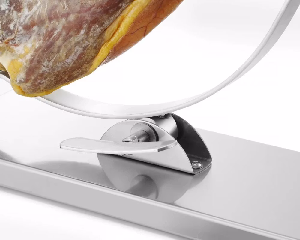 Konstruktionen i rostfritt stål med satinfinish ger både hållbarhet och ett professionellt utseende. Skinkan fästs säkert med en skruv i den roterande monteringsringen (Ø80 mm), vilket gör det enkelt att vrida skinkan för optimal åtkomst under hela skärprocessen. Det justerbara lutningssystemet gör att vinkeln kan anpassas efter behov, vilket förbättrar ergonomi och kontroll.