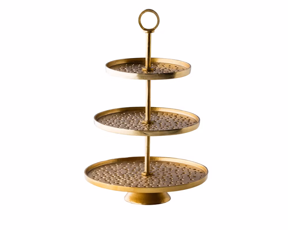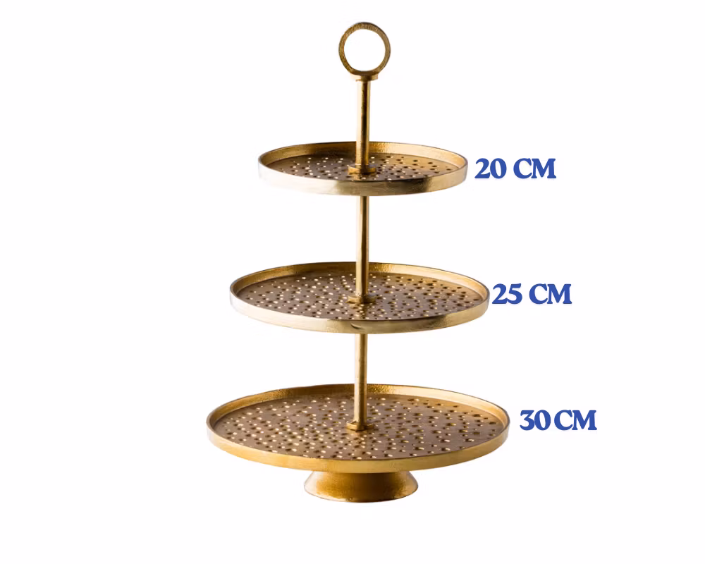 Golden Etagère 3-våningar Ø30/25/20 cm – elegant serveringsställ i guld för exklusiv presentation