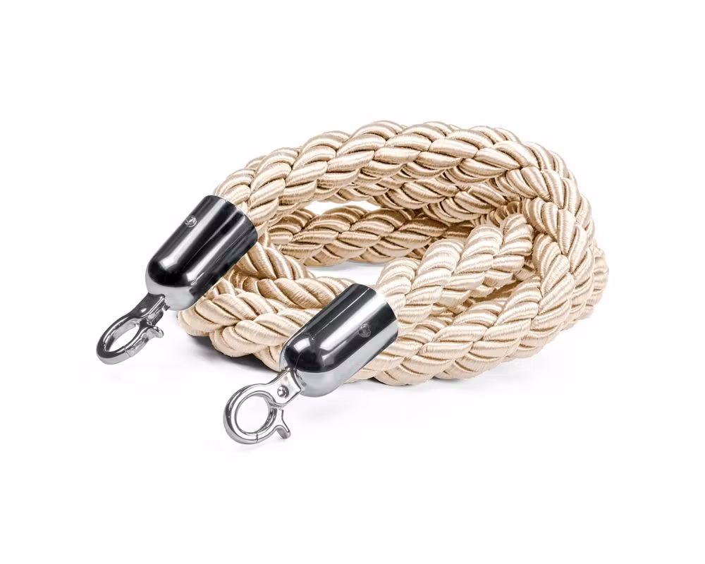 Elegant flätat avspärrningsrep i beige med silverfärgade krokar, utformat för att användas tillsammans med köstolpar i miljöer där både funktion och estetik är viktiga. Repet har en längd på 150 cm och är idealiskt för att skapa tydliga kölinjer, avgränsningar och entrépassager i exempelvis restauranger, hotell, eventlokaler, teatrar och andra offentliga miljöer.