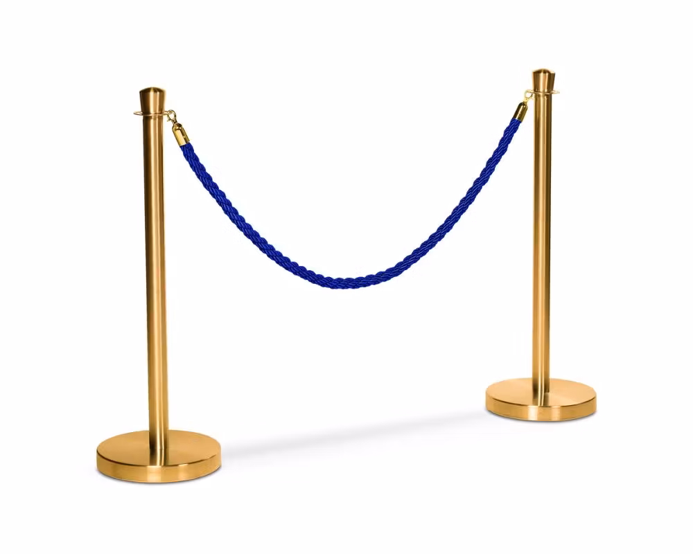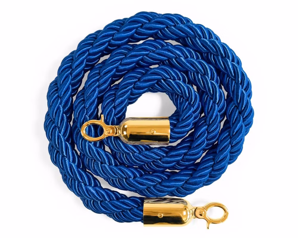 Flätat avspärrningsrep i blått med guldfärgade krokar, utformat för att användas tillsammans med köstolpar i miljöer där man vill skapa tydliga kölinjer, exklusiva entréer och organiserade besöksflöden. Med sin längd på 150 cm passar repet perfekt mellan standardköstolpar och används ofta i restauranger, hotell, nattklubbar, teatrar, mässor och eventmiljöer.