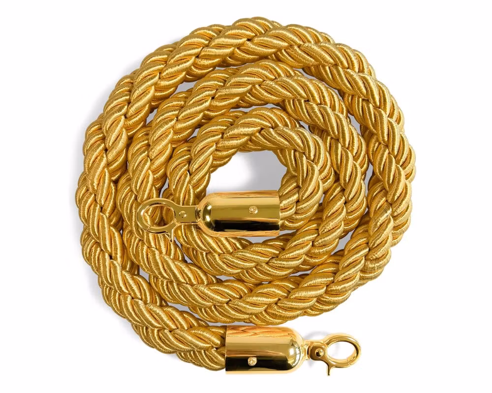 Exklusivt flätat avspärrningsrep i guld med guldfärgade krokar, framtaget för köstolpar i miljöer där man vill skapa eleganta entréer, tydliga avgränsningar och en professionell köhantering. Med en längd på 150 cm passar repet perfekt mellan standardköstolpar och används ofta i hotell, restauranger, nattklubbar, teatrar, event och VIP-områden.
