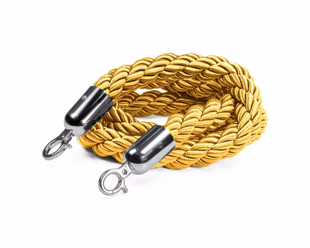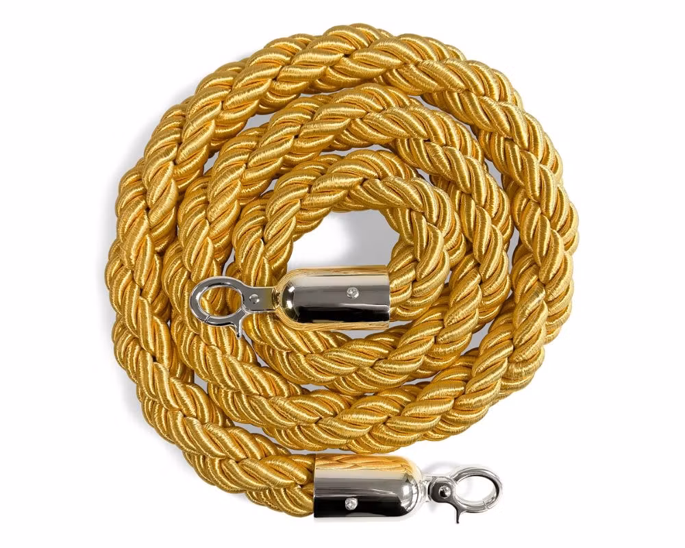 Flätat avspärrningsrep i guld med silverfärgade krokar, framtaget för köstolpar i miljöer där man vill skapa tydliga kölinjer, exklusiva entréer och organiserade avspärrningar. Med en längd på 150 cm är repet anpassat för standardavstånd mellan köstolpar och används ofta i restauranger, hotell, nattklubbar, teatrar, mässor och eventmiljöer.
