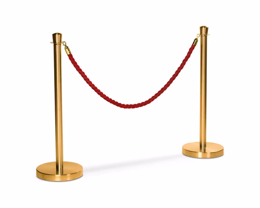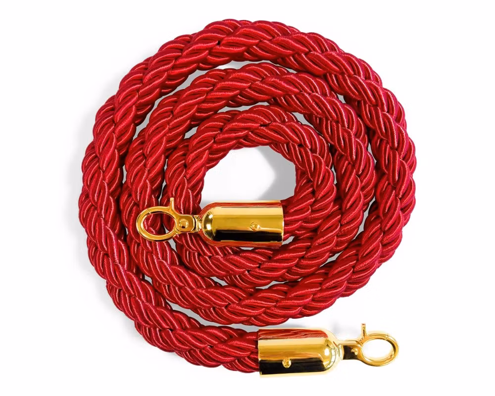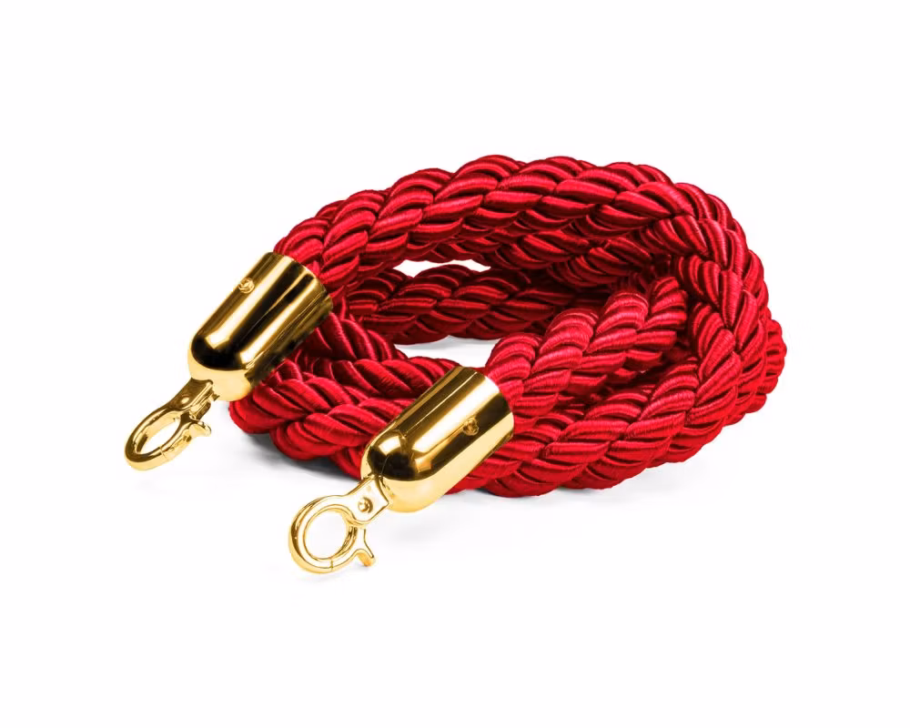 Flätat avspärrningsrep i röd färg med guldfärgade krokar, framtaget för köstolpar i miljöer där man vill skapa exklusiva entréer, tydliga kölinjer och organiserade avspärrningar. Med en längd på 150 cm passar repet perfekt mellan standardköstolpar och används ofta i hotell, restauranger, nattklubbar, teatrar, biografer, mässor och eventmiljöer.