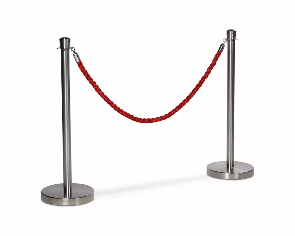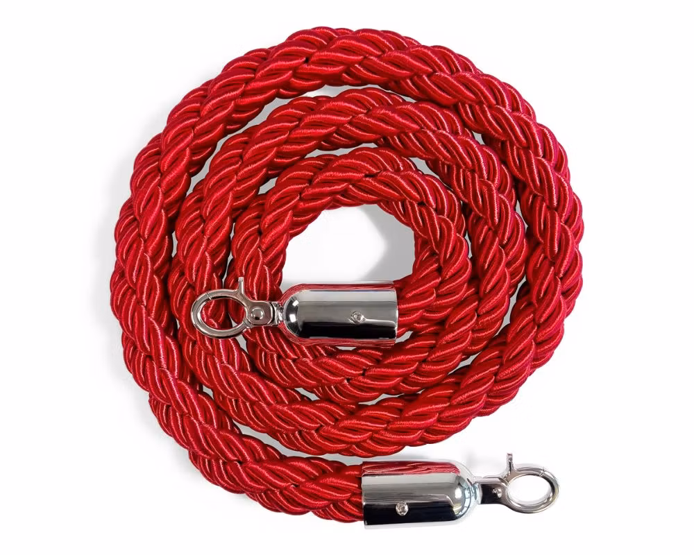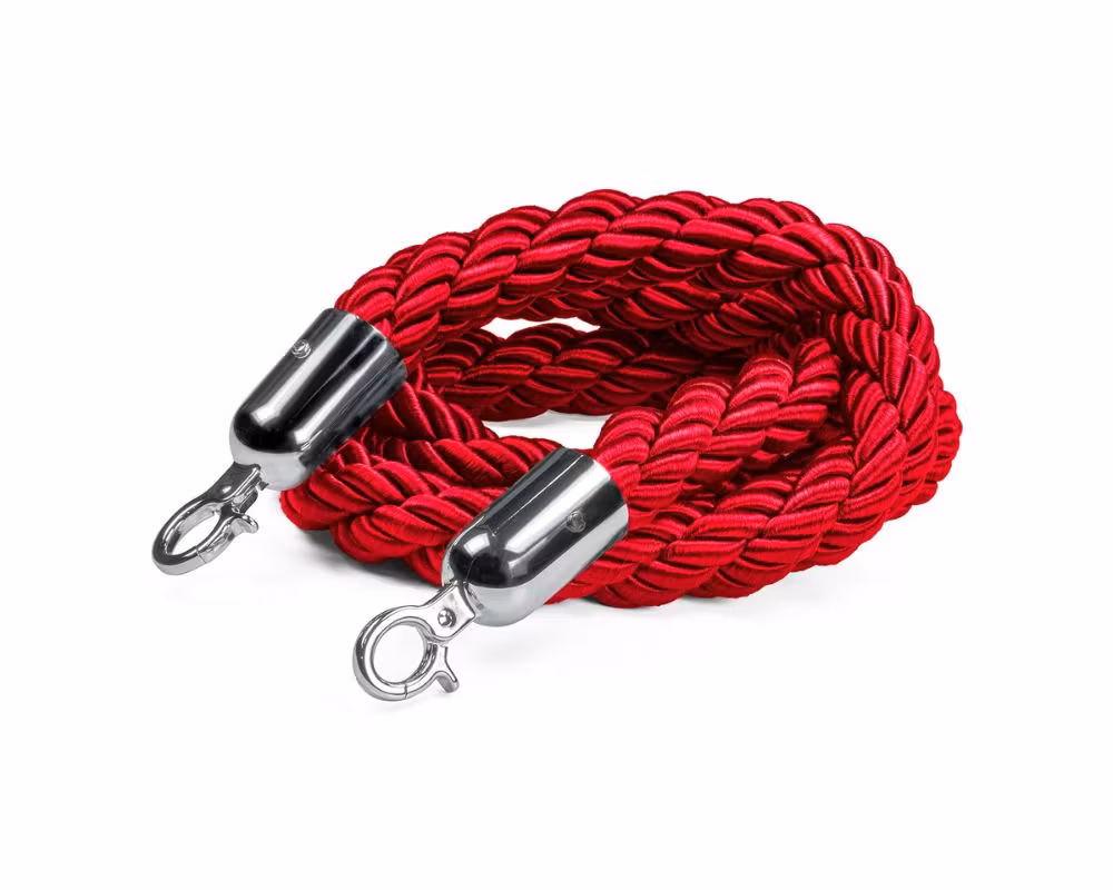 Flätat avspärrningsrep i röd färg med silverfärgade krokar, utformat för att användas tillsammans med köstolpar där man vill skapa tydliga kölinjer, exklusiva entréer och organiserade avspärrningar. Med en längd på 150 cm passar repet perfekt mellan standardköstolpar och används ofta i hotell, restauranger, nattklubbar, teatrar, biografer, mässor och eventmiljöer.