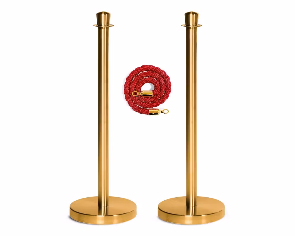 Setet består av två guldfärgade stolpar i rostfritt stål samt ett flätat rött rep på 150 cm, vilket ger ett klassiskt och elegant uttryck. Kombinationen av guld och rött är ett tidlöst val som passar perfekt i miljöer där man vill skapa en exklusiv känsla vid entréer, VIP-områden eller köhantering.