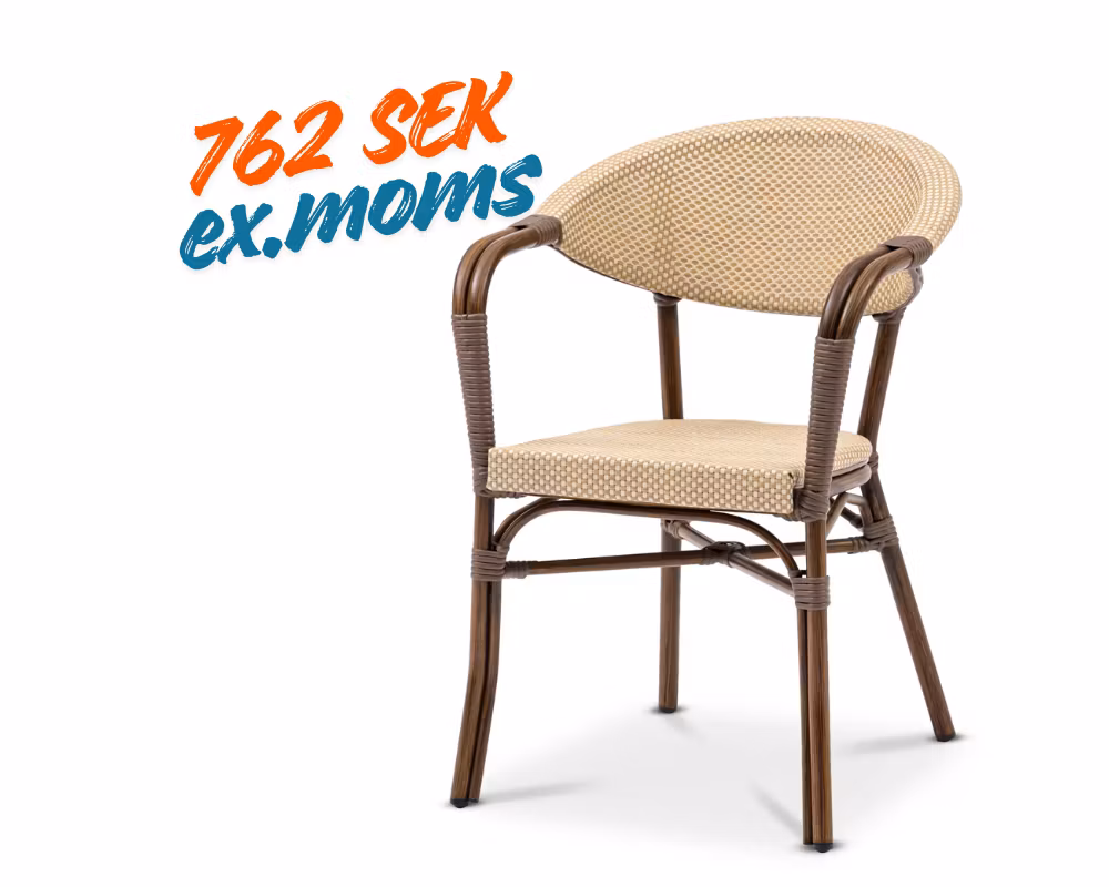 Stolen har en lättare vikt, vilket gör den enkel att hantera och flytta vid behov. Tillverkad med en brunlackerad aluminiumstomme på Ø 28 mm, som ger både stabilitet och hållbarhet samtidigt som den är lätt att transportera. Sitsen och ryggen är tillverkade av slitstarkt textiline i en naturlig brun och beige färg, vilket både ger en elegant trä-look och gör stolen väderbeständig.