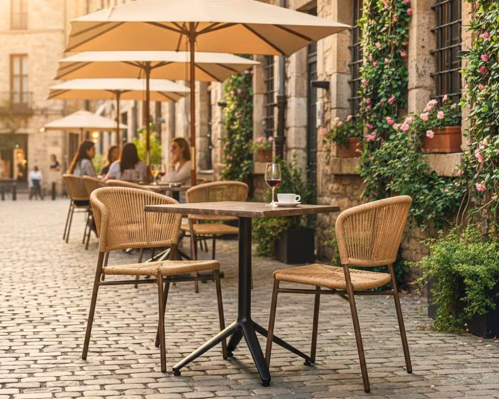Den slitstarka fiberrottingen på sitsen och ryggstödet påminner om rep, vilket skapar en rustik estetik samtidigt som den erbjuder långvarig hållbarhet. Stolen är byggd med en Ø 25 mm brunlackerad aluminiumstomme, vilket ger den en låg vikt för enkel hantering utan att kompromissa på stabiliteten.